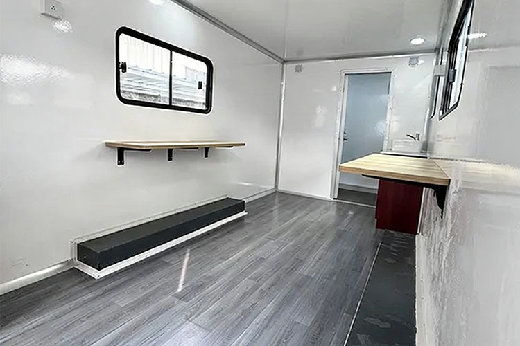The body adopts one-piece insulated composite panels, combined with integrated metal connection profiles. This “insulated-box-grade” structural standard ensures that the mobile office trailer retains superior sealing performance and structural stability even after long-term relocation, vibration, and frequent use.