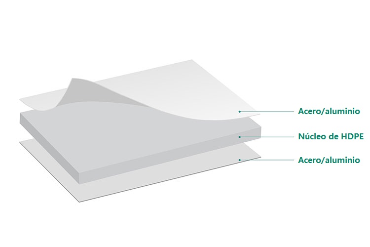 Revestimiento: acero galvanizado (límite de fluencia de 80 000 psi); revestimiento: acabado horneado de poliéster; núcleo: polietileno de alta densidad.