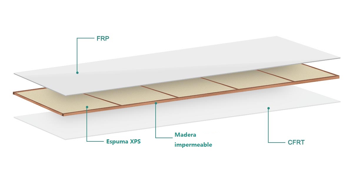 - Núcleo: El material del núcleo intermedio es espuma XPS (poliestireno extruido), que proporciona aislamiento térmico y suficiente resistencia de soporte.
